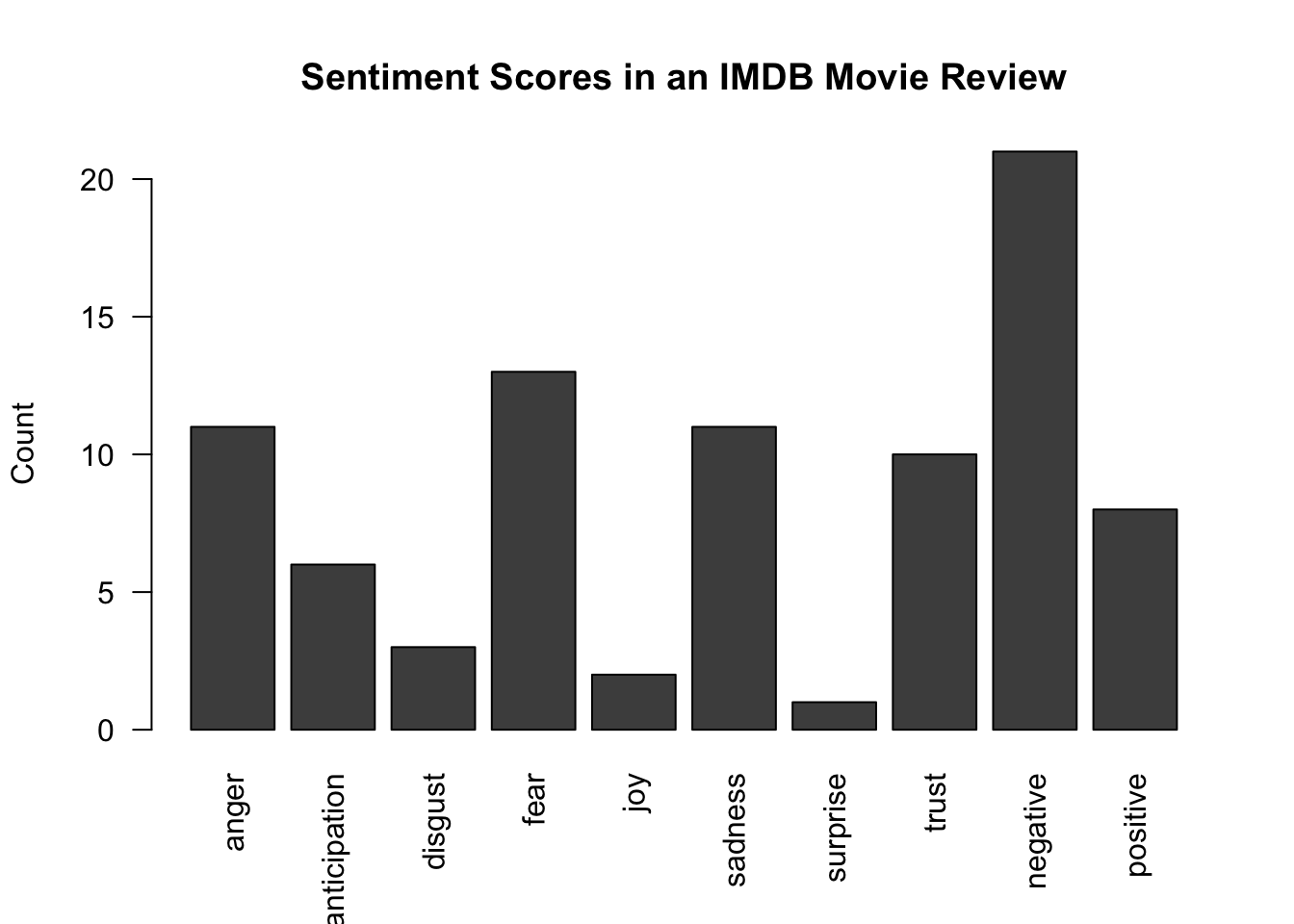 However, visual inspection of the actual review reveals it is positive in nature. This highlights a key limitation of lexicon-based sentiment analysis: it does not account for context. The high scores for fear, anger, and sadness likely reflect the reviewer describing the film’s plot — discussing scary or tense scenes — rather than expressing dissatisfaction with the movie. This approach accounts for term frequency but cannot distinguish between describing negative content positively versus expressing genuine criticism of the film.