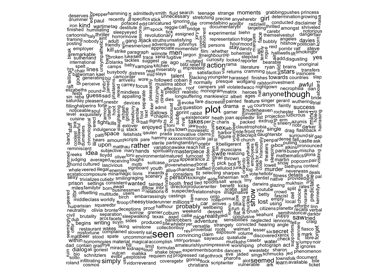The word cloud highlights the terms that occur most frequently across the corpus. Larger words, such as “many,” “performance,” “plot,” “game,” “classic,” and “hotel,” indicate repeated appearance in reviews and reflect common themes related to storytelling, acting quality, and genre conventions. Additionally, expressive adjectives such as “difficult,” “appropriate,” “fabulous,” and “unexpectedly” suggest that reviewers frequently rely on emotional and descriptive language to articulate their reactions to the films.